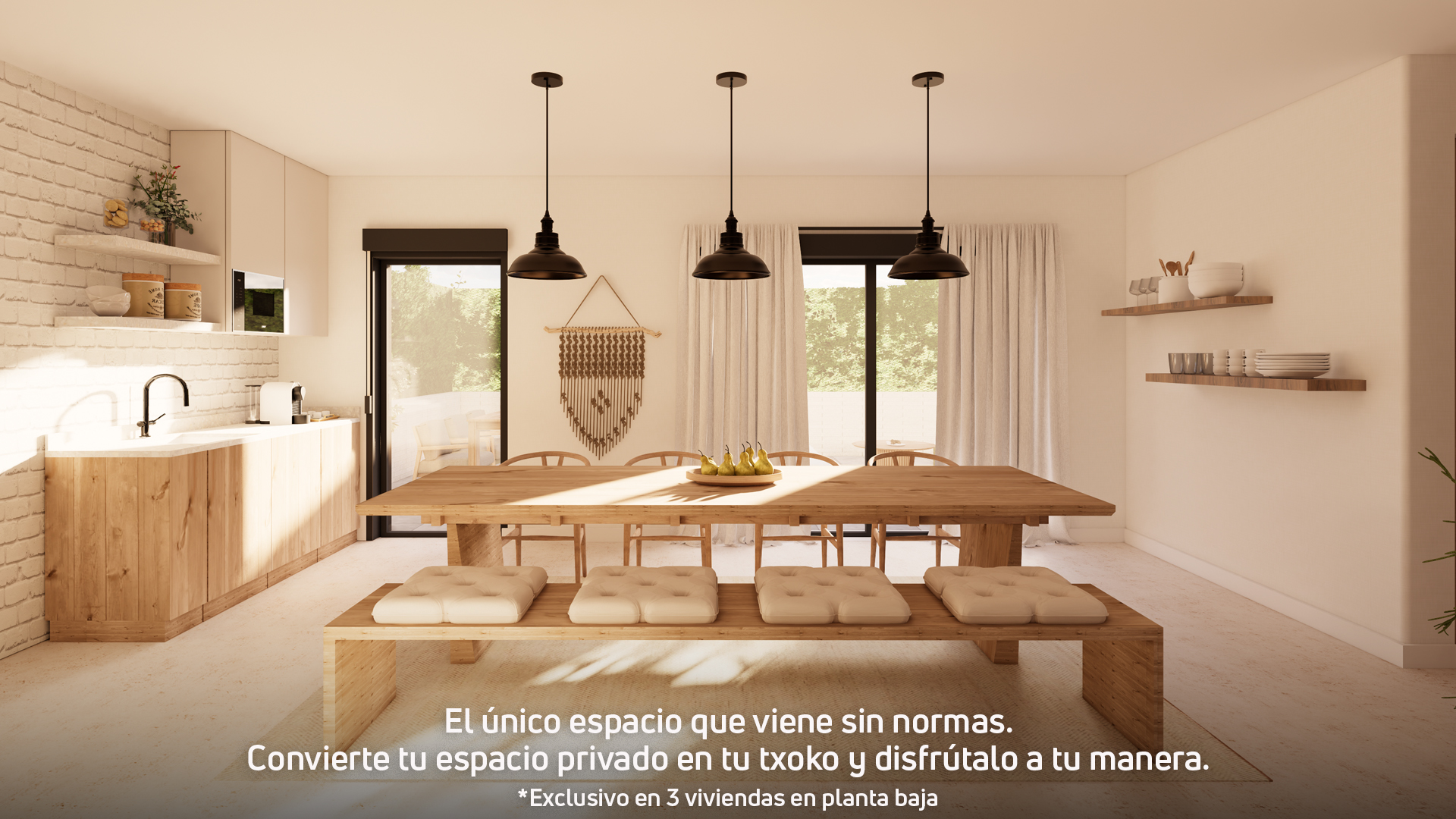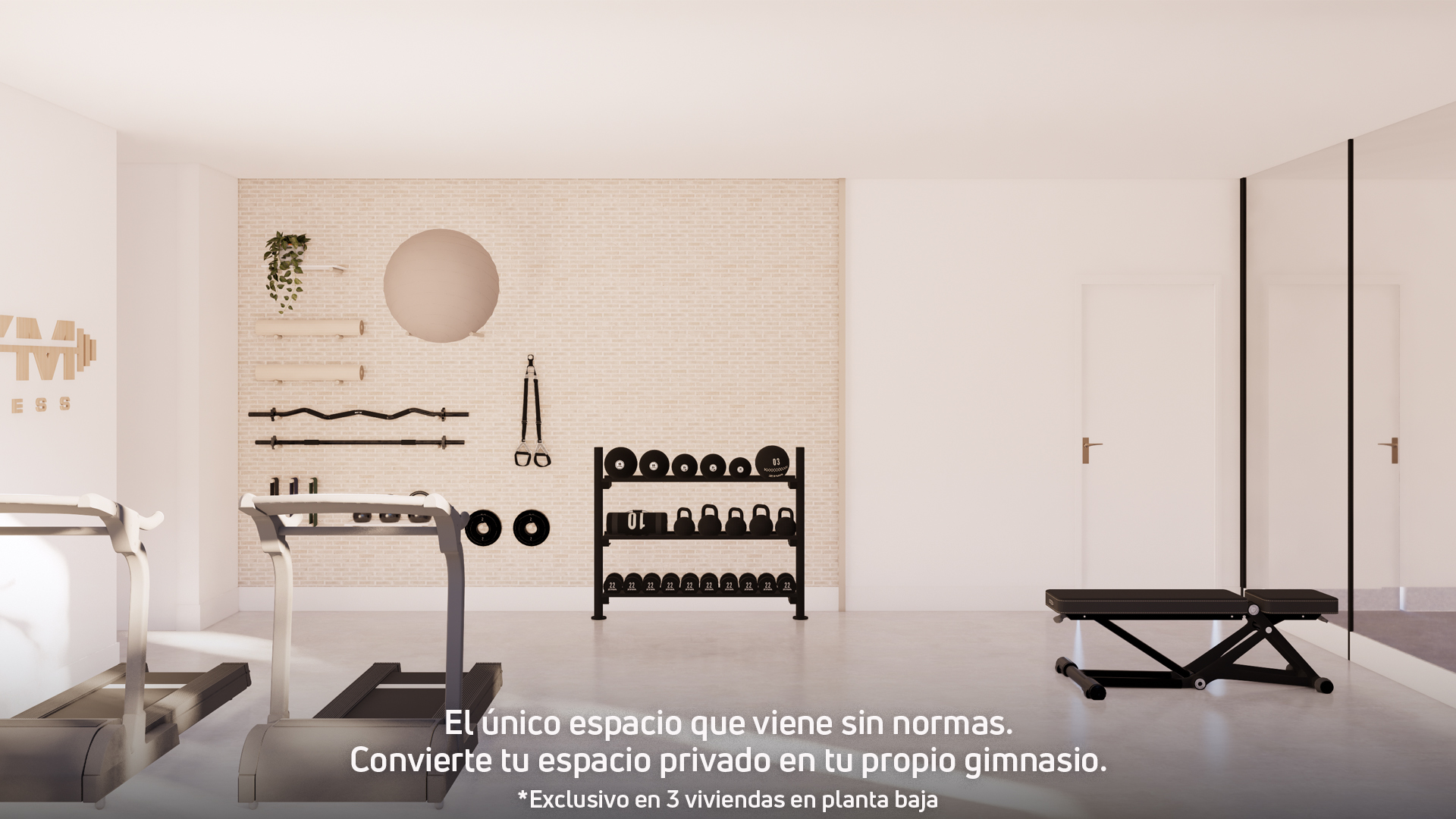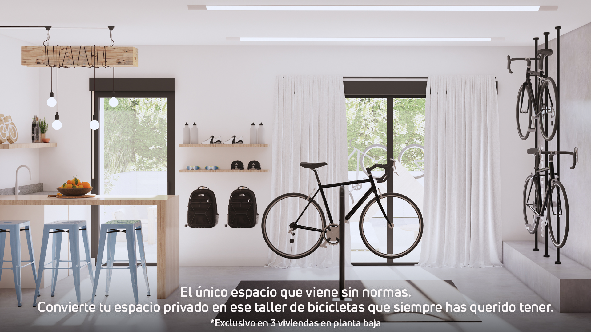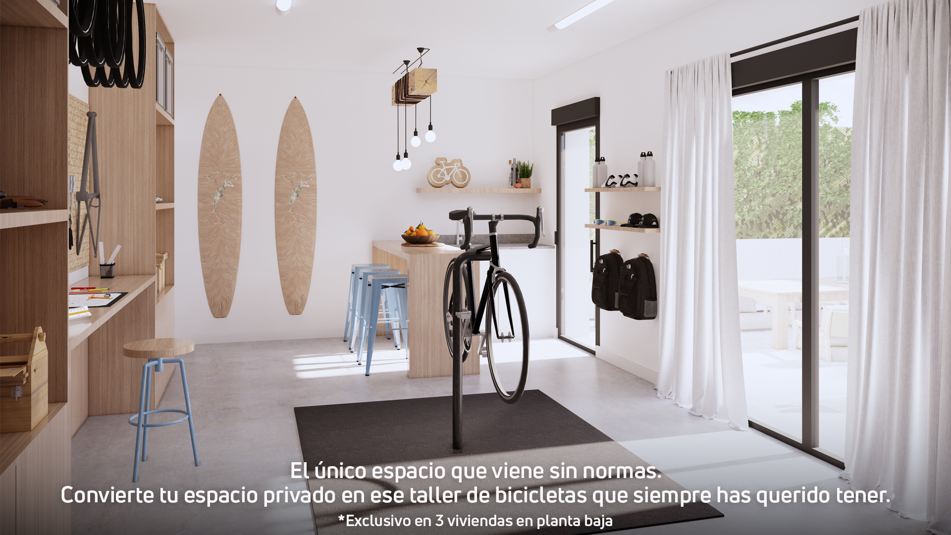 La promoció compta a més amb 3 habitatges a planta baixa que disposen d'una sala privativa amb accés independent des del jardí. Un espai versàtil que podràs adaptar al teu estil de vida: el taller de bicicletes que sempre has volgut, el teu gimnàs o un txoko per gaudir amb família i amics.